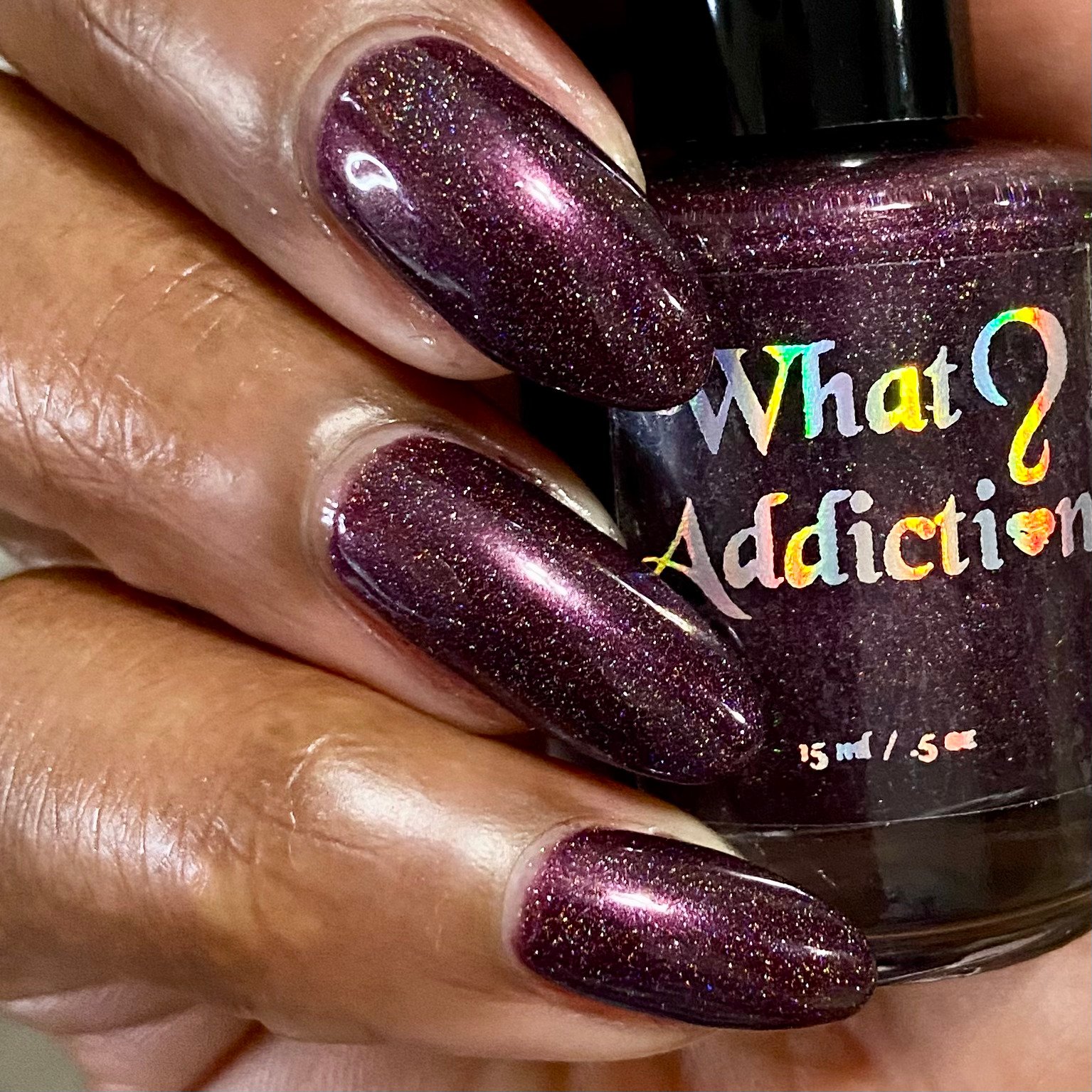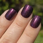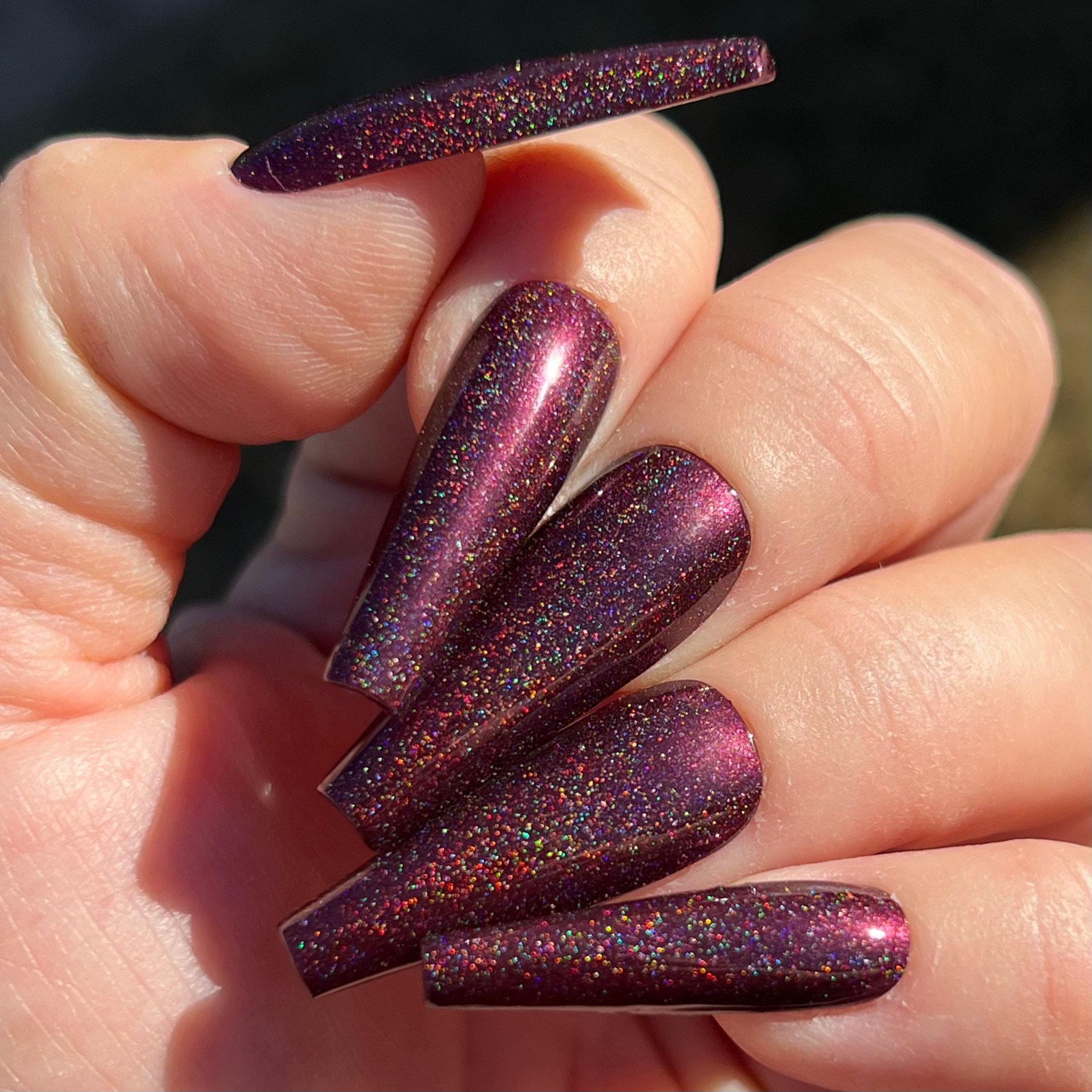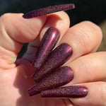 A blackened red base filled with red shimmer and small particle holographic pigment.