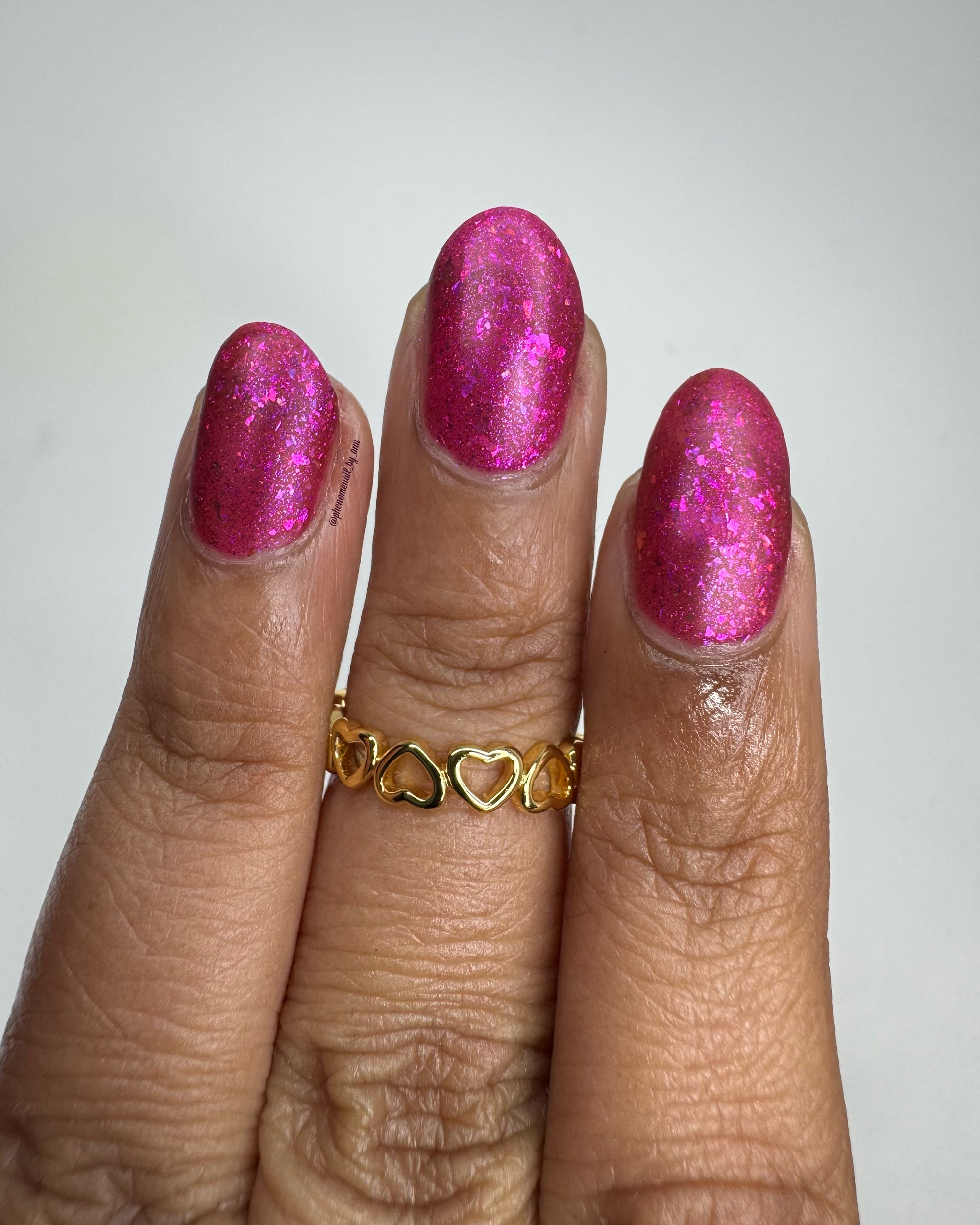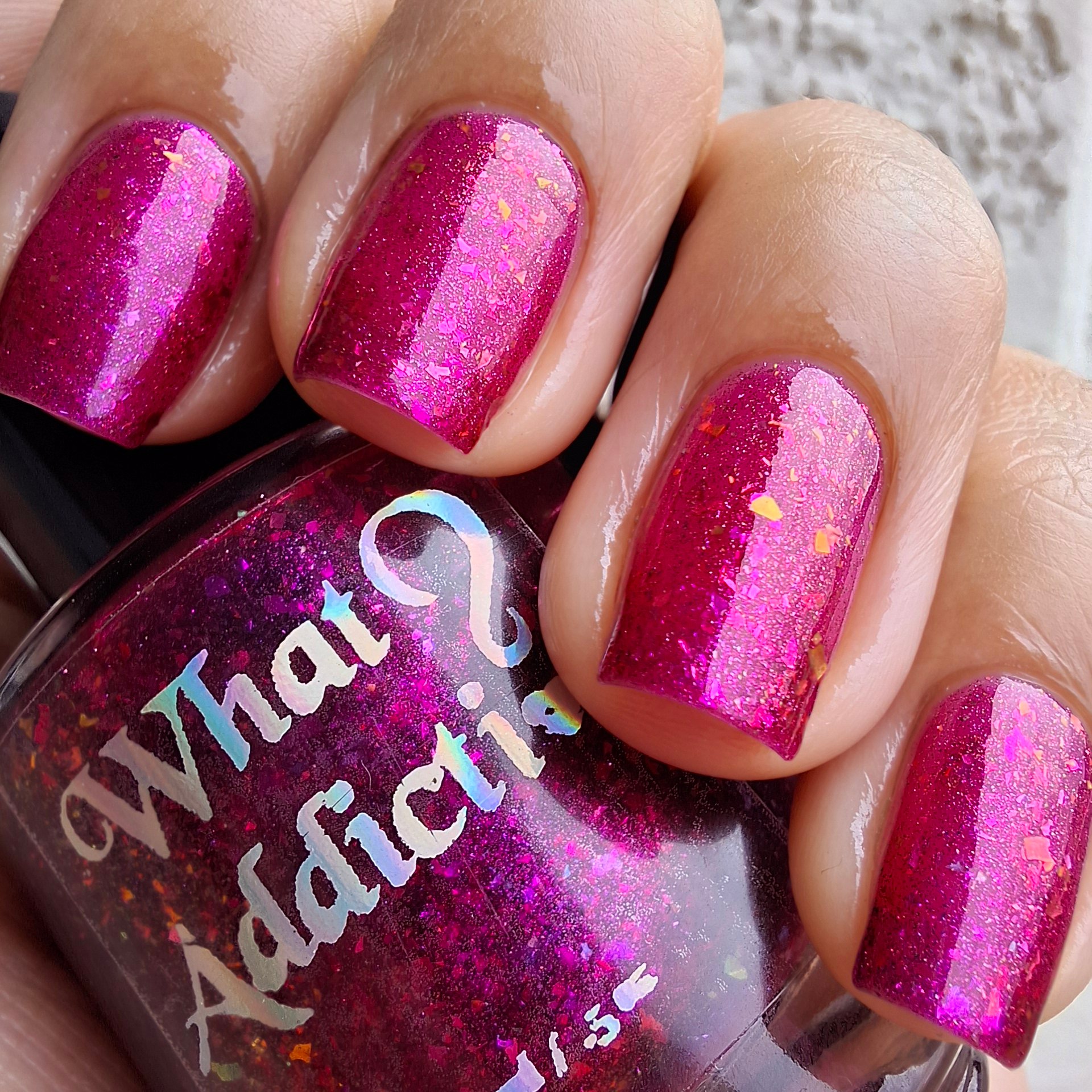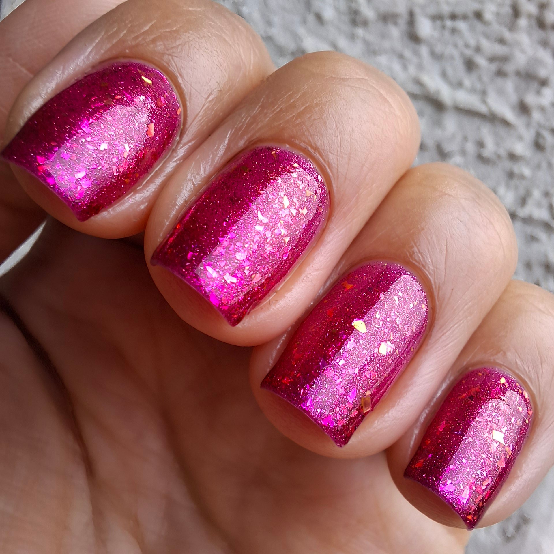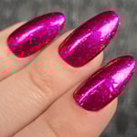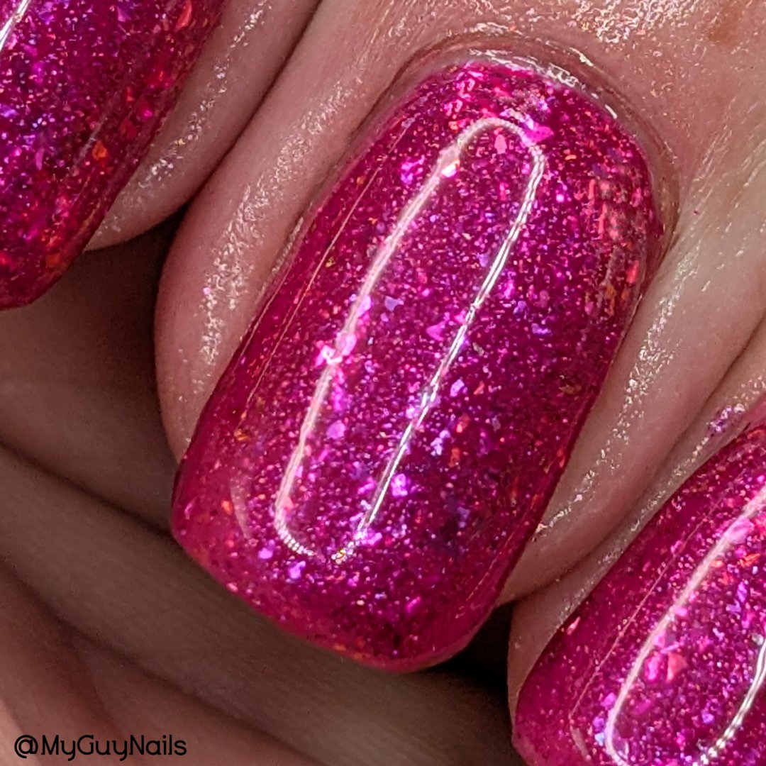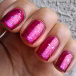 A jewel toned pink base, pink/orange shimmer and pink/orange flakes.