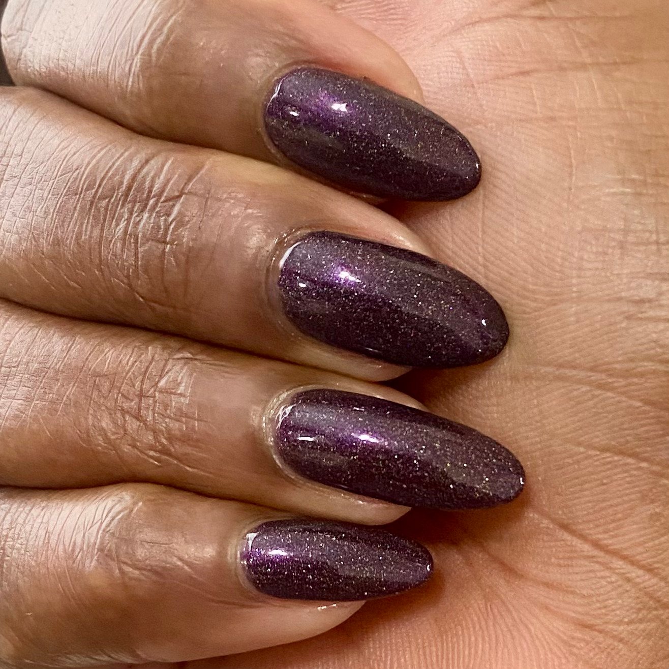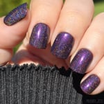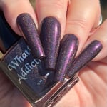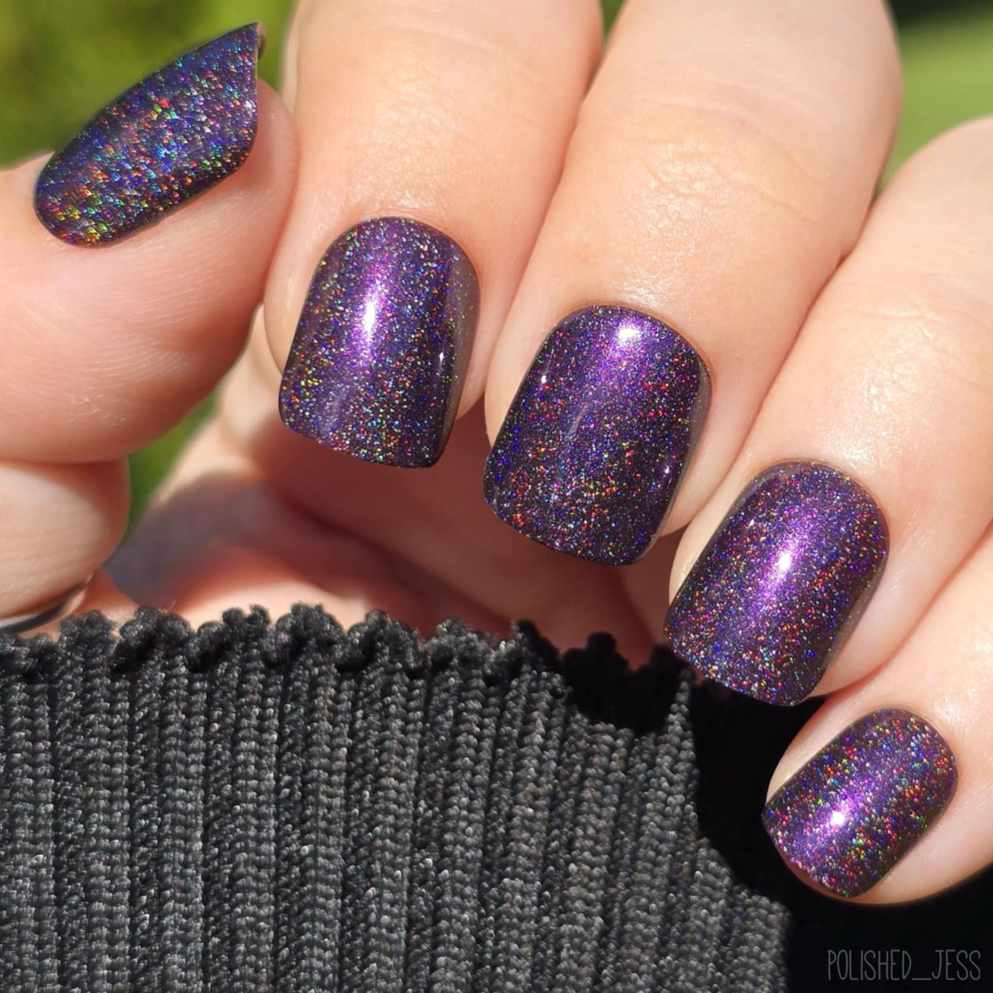 A blackened plum purple base filled with purple shimmer and small particle holographic pigment.