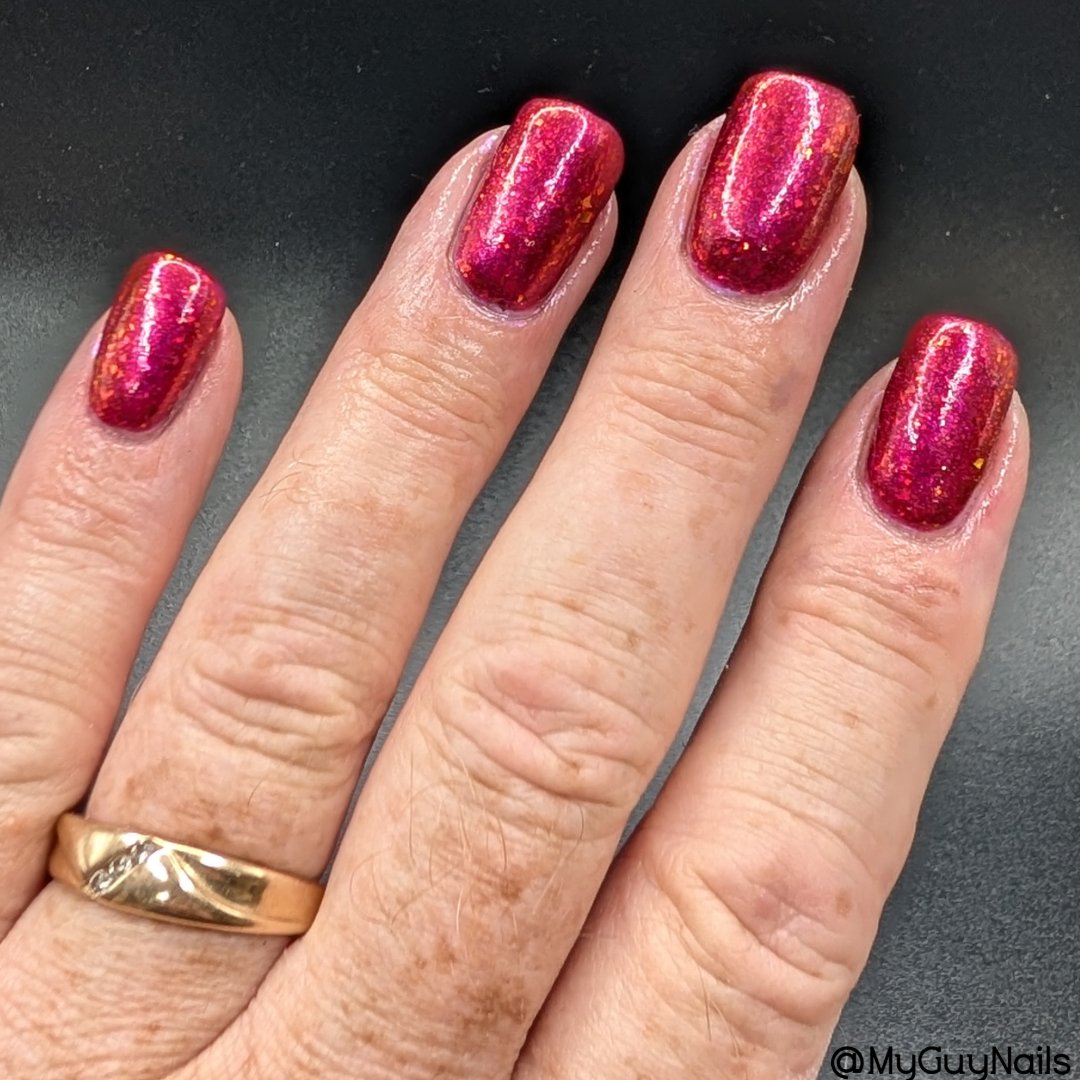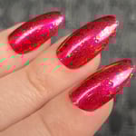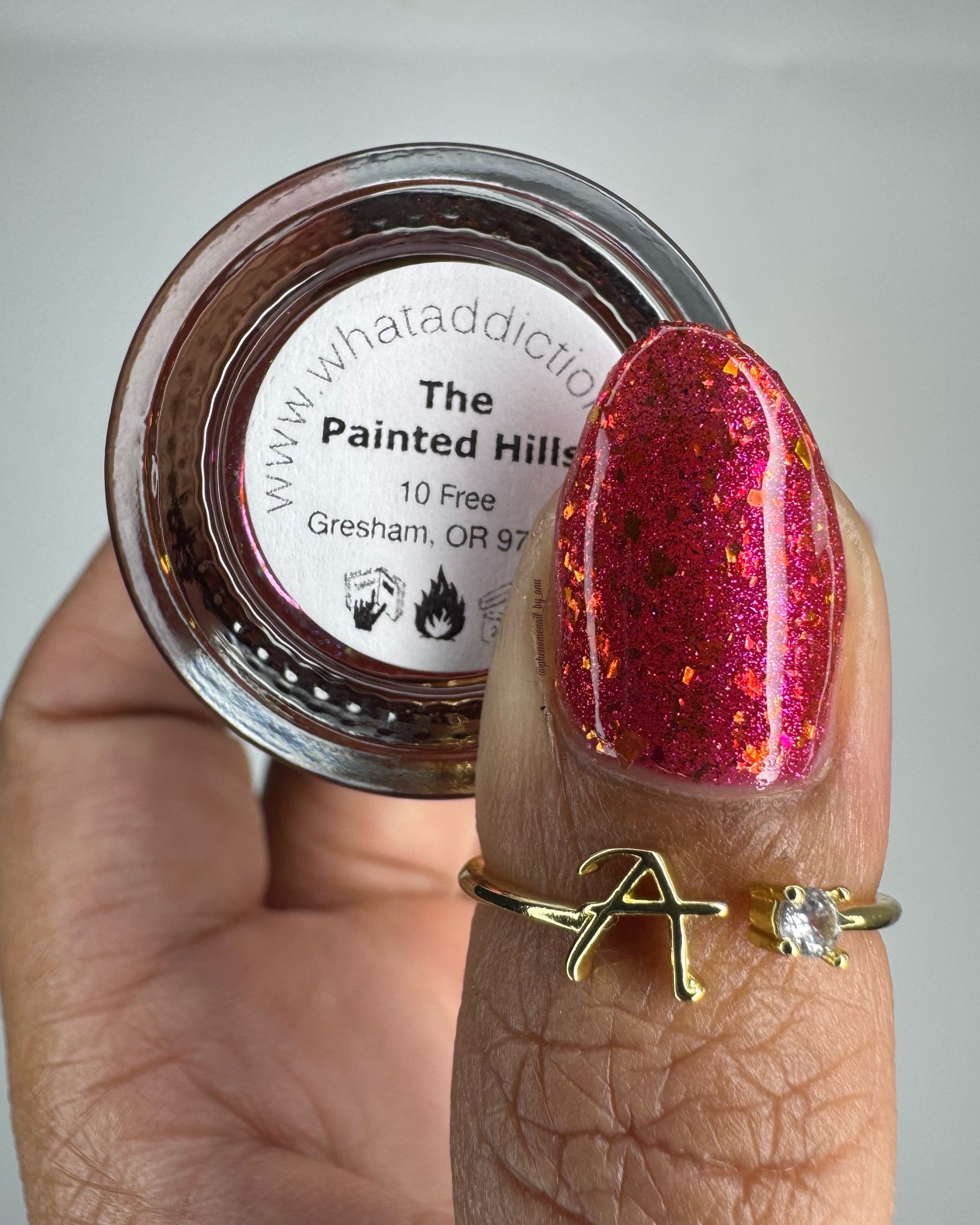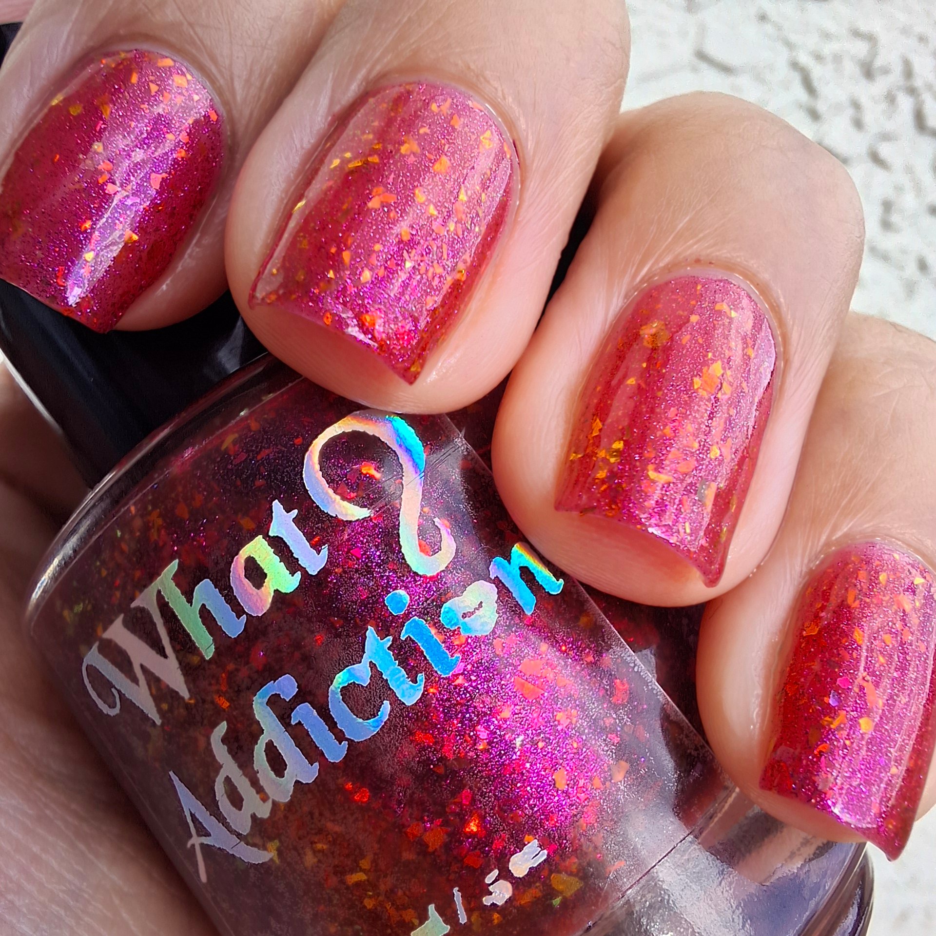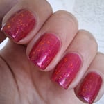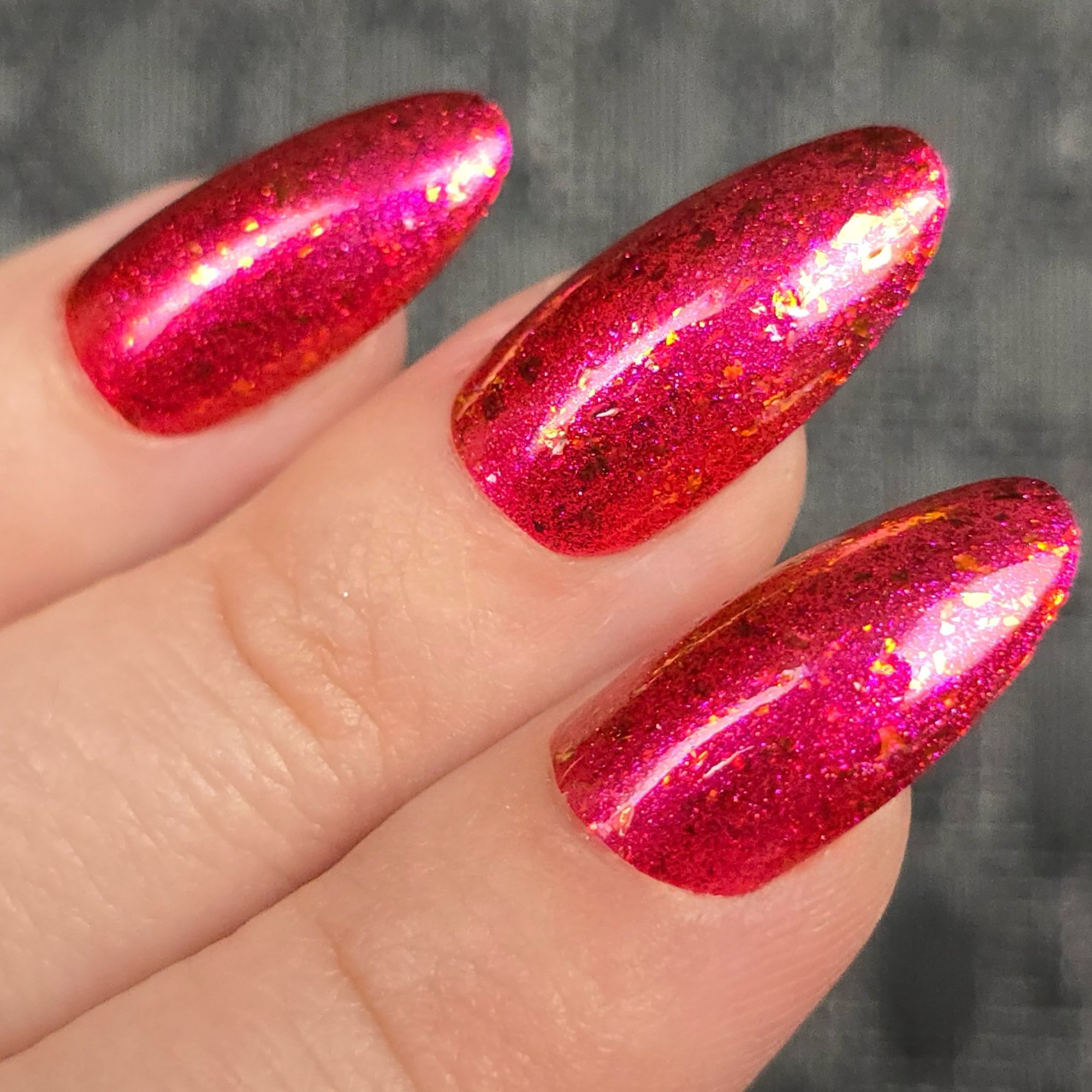 A jewel toned orange with pink undertones, orange/gold shimmer and orange/pink flakes.