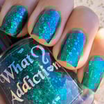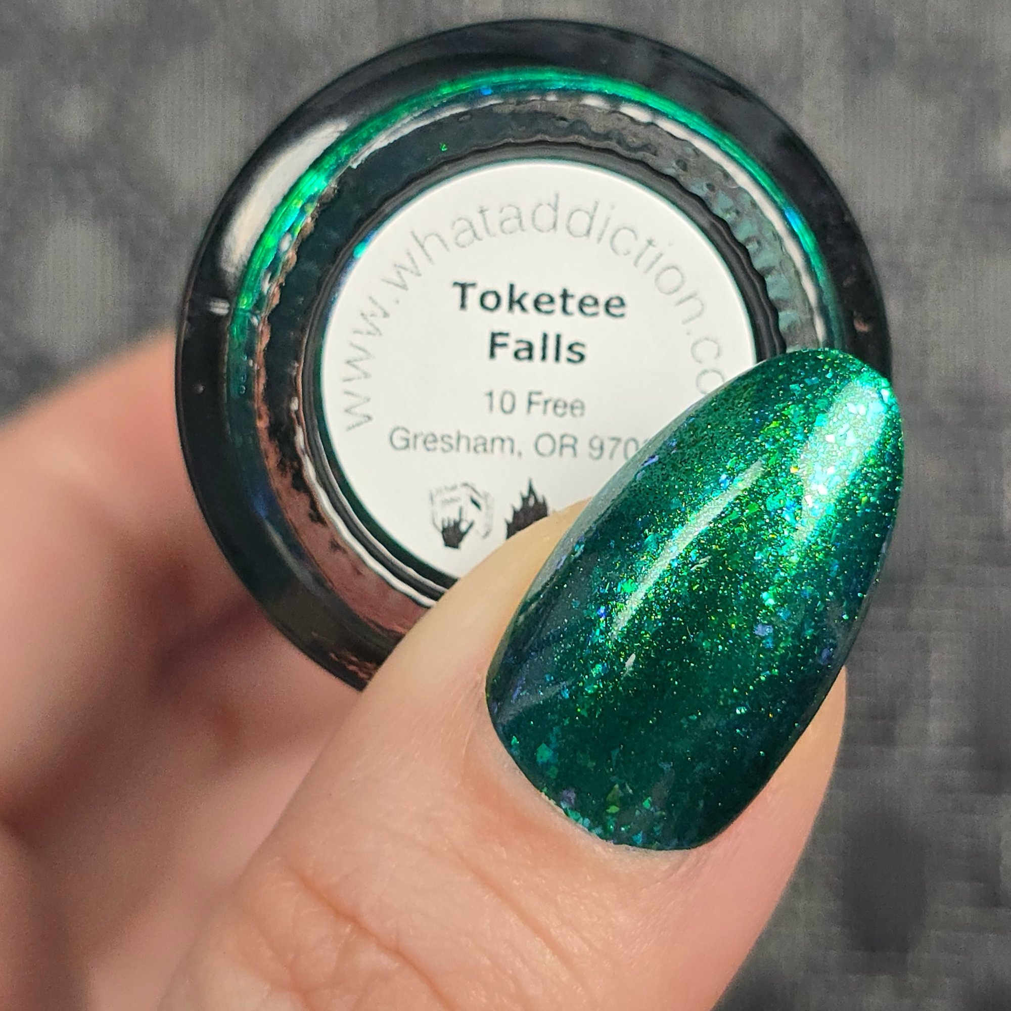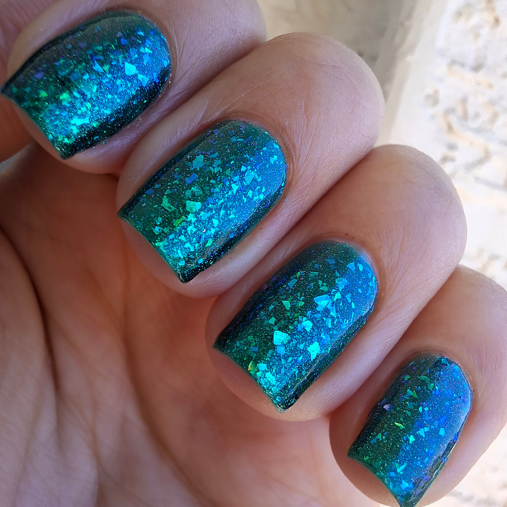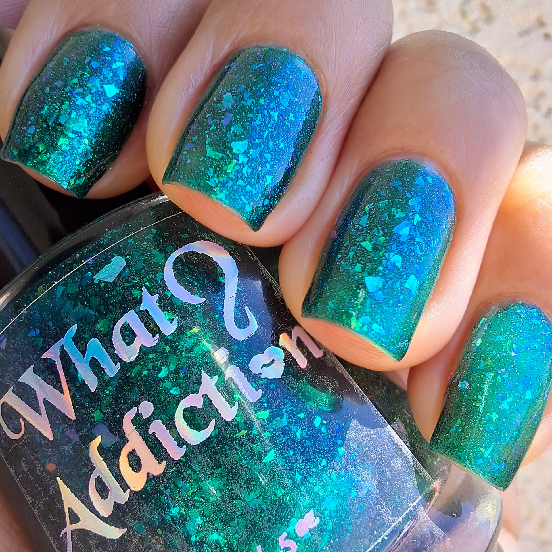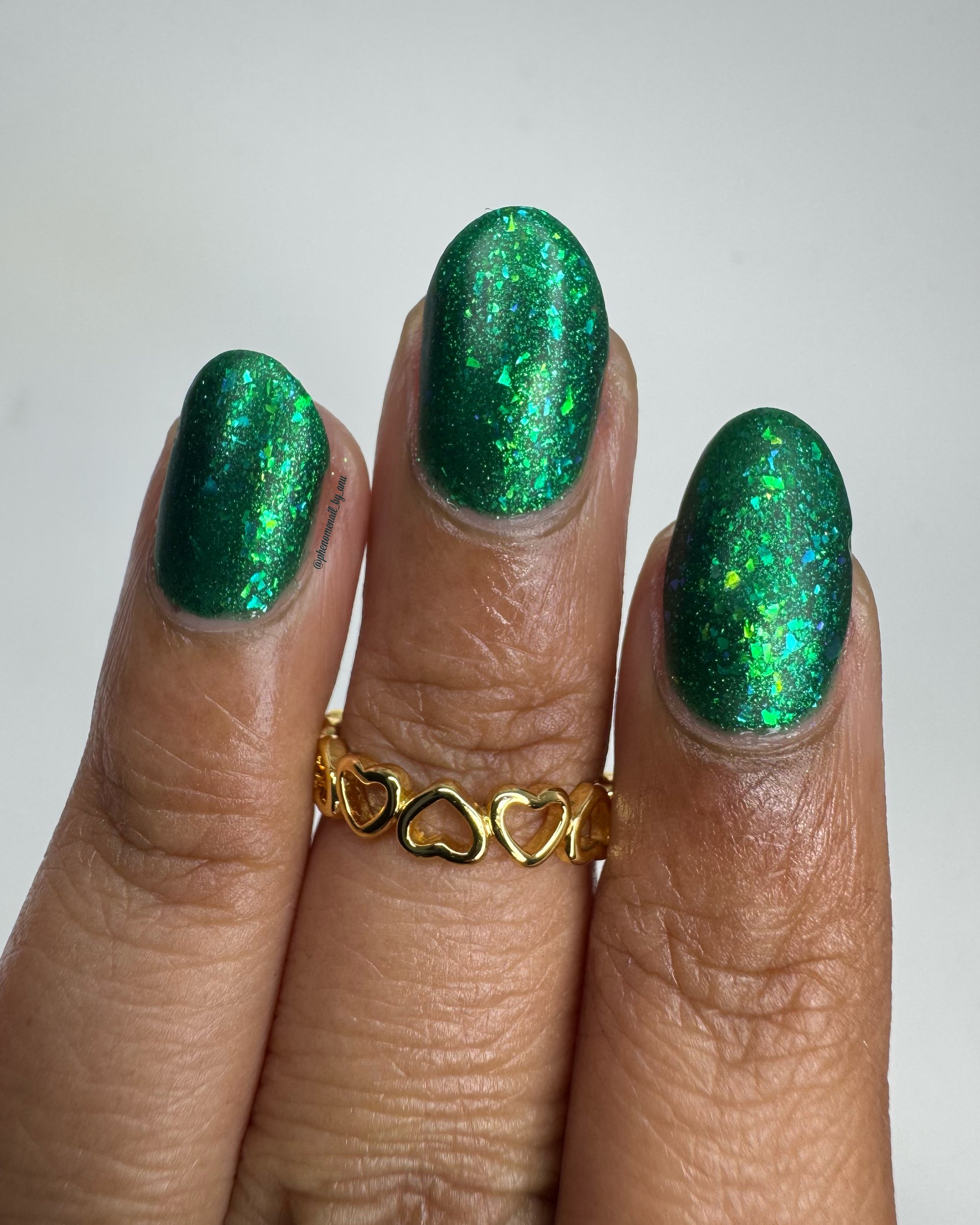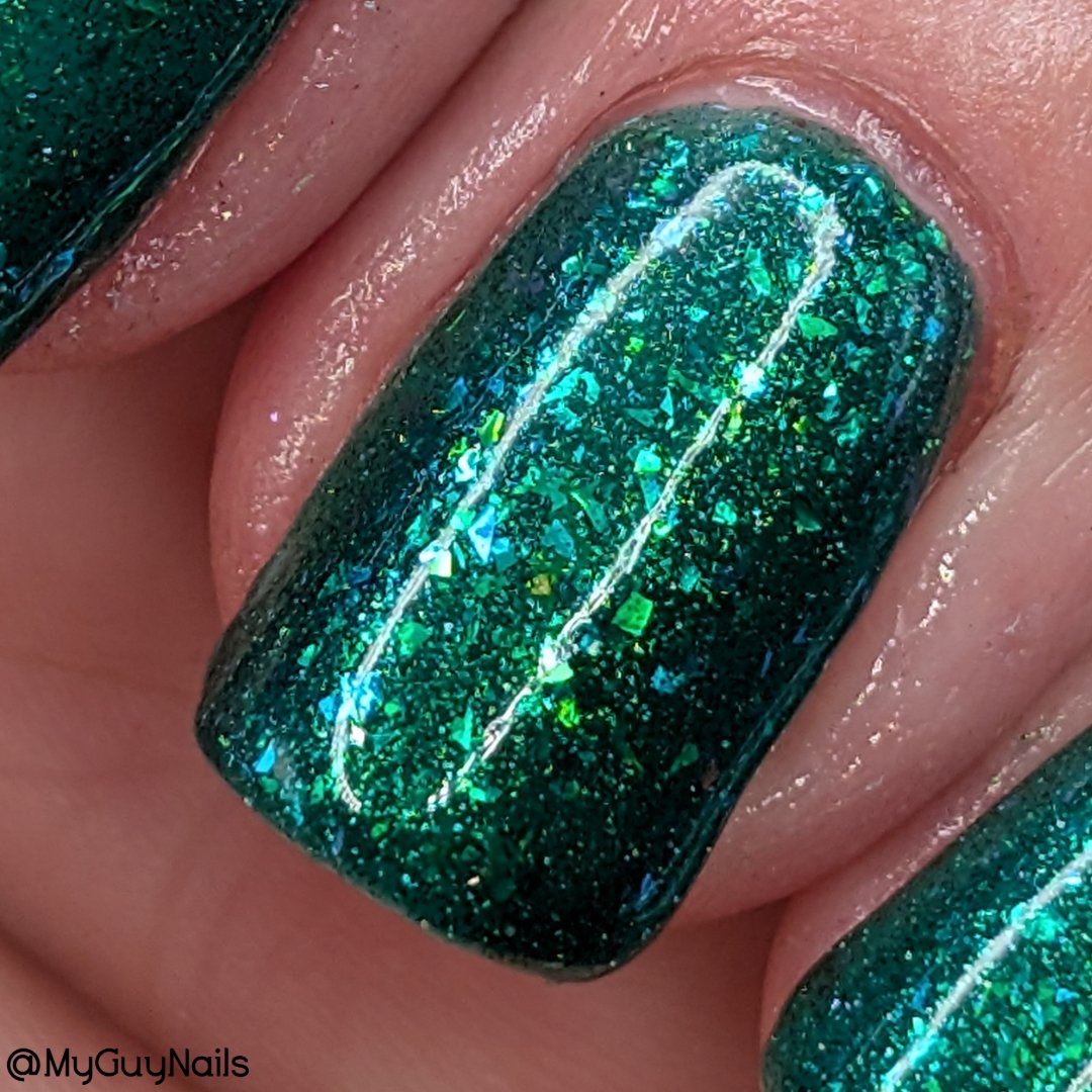 A jewel toned emerald green base, green/purple shimmer, green/blue/purple flakes.